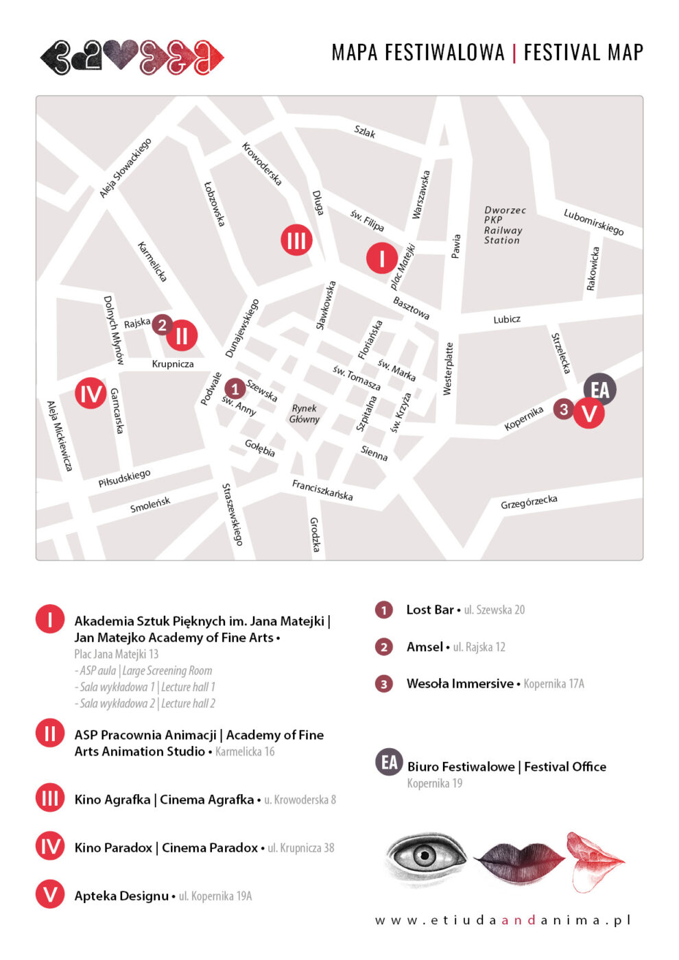 Etiuda&Anima Festival is constantly expanding the number of festival objects for viewers’ convenience. All festival objects are very well localised and easily available for Polish and foreign viewers, accessible from Main Railway Station and Main Market Square.